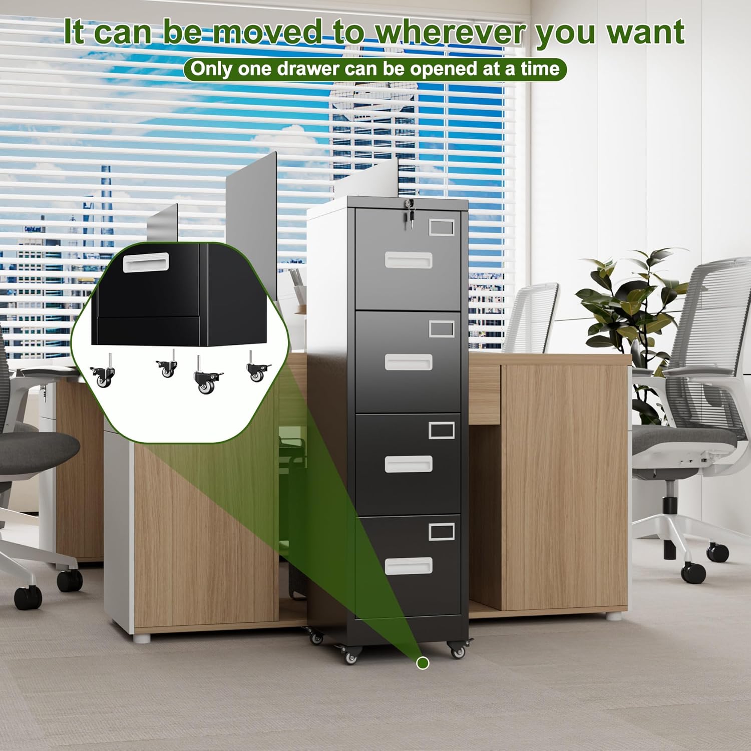 - [High Quality Metal Material] 4 Drawer File Cabinet with Wheels is made into high quality metal material,Powder coating process bonds and bakes the protective coating to the bare metal, forming an effective barrier against corrosion,which is ideal for long-term use.