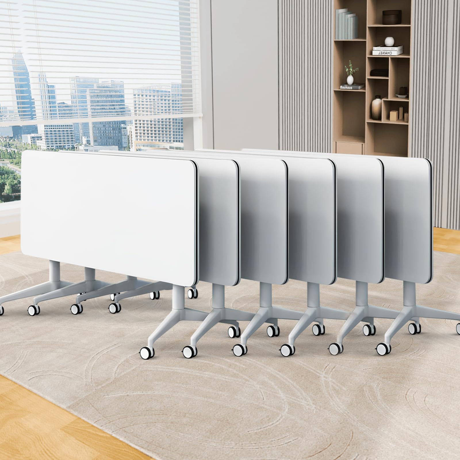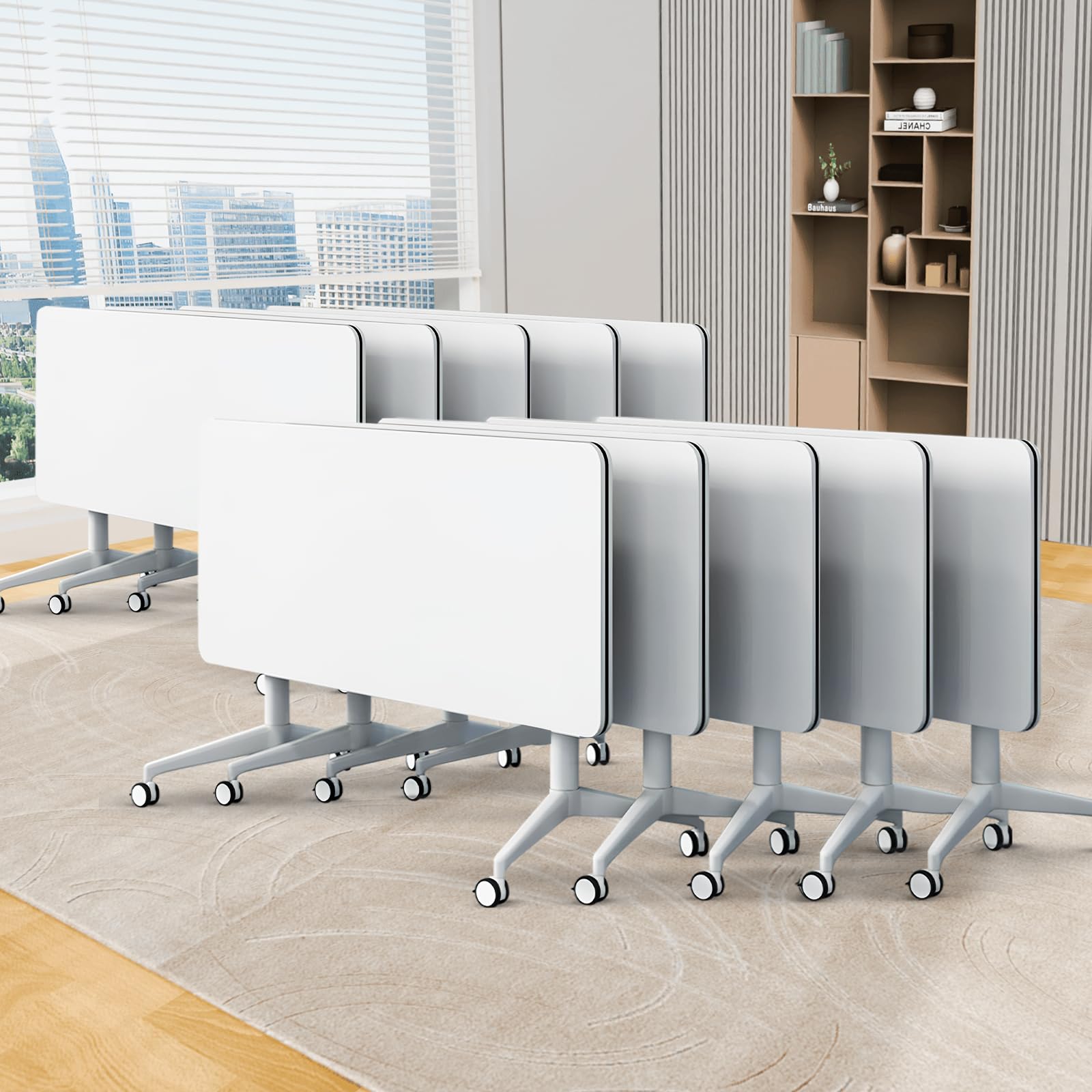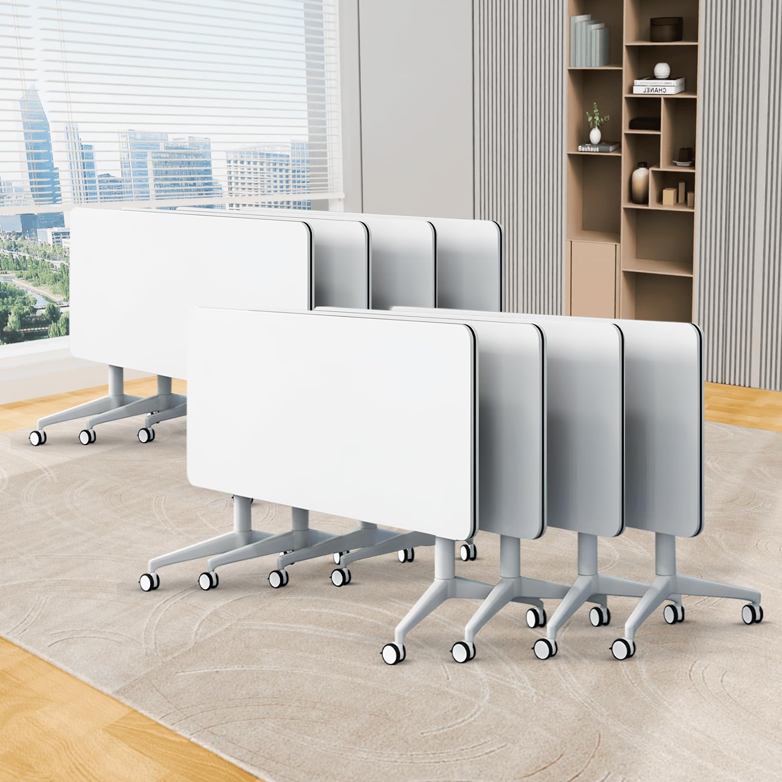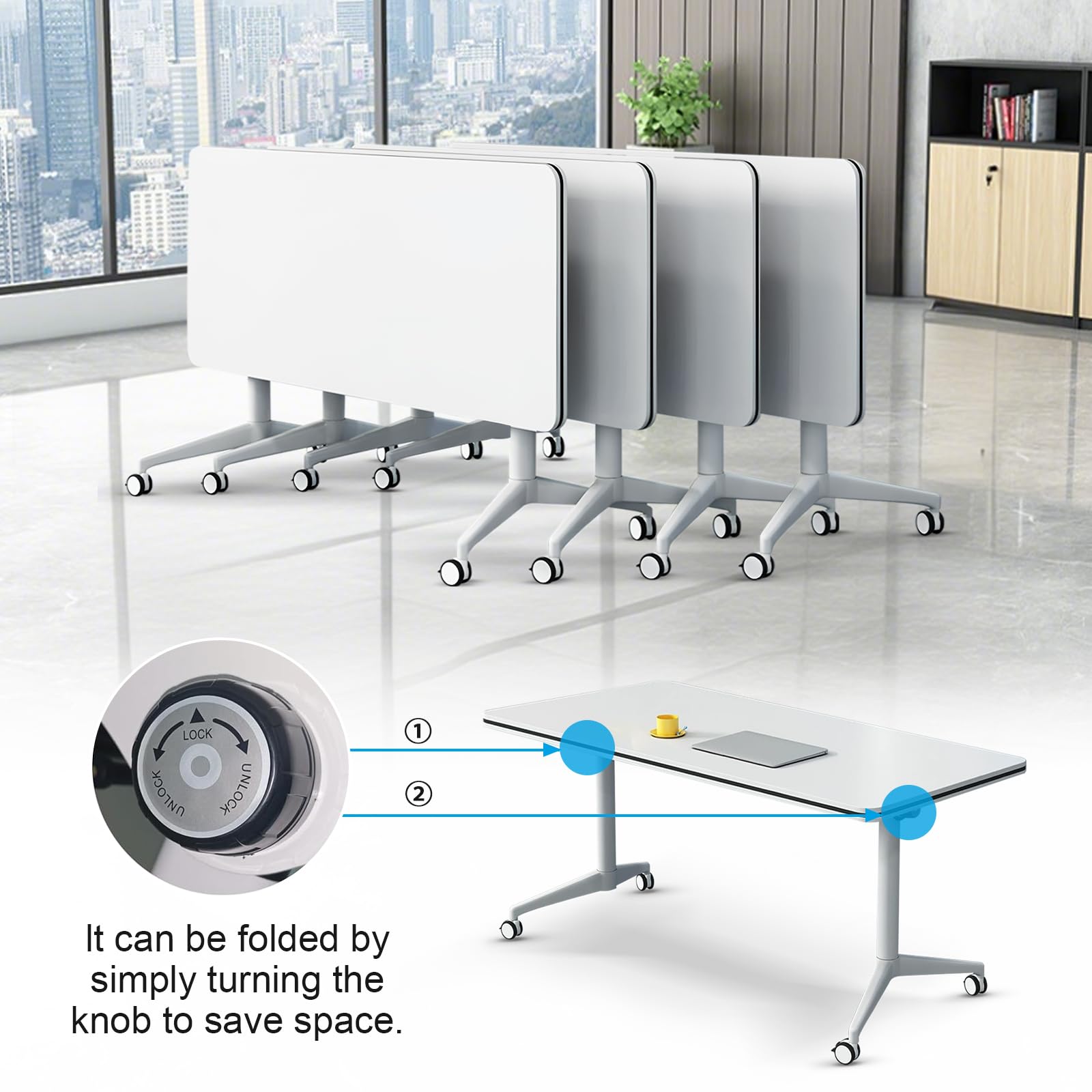 - ✅【Foldable Conference Table】The folding conference table with wheels is convenient and fast, and it can be quickly folded, unfolded or spliced. Equipped with foldable buttons on both sides, just a slight twist can quickly flip fold and automatically lock, portable and easy to store. The flip-top mobile conference tables are more userfriendly and can be stacked for storage to save space and avoid office crowding.